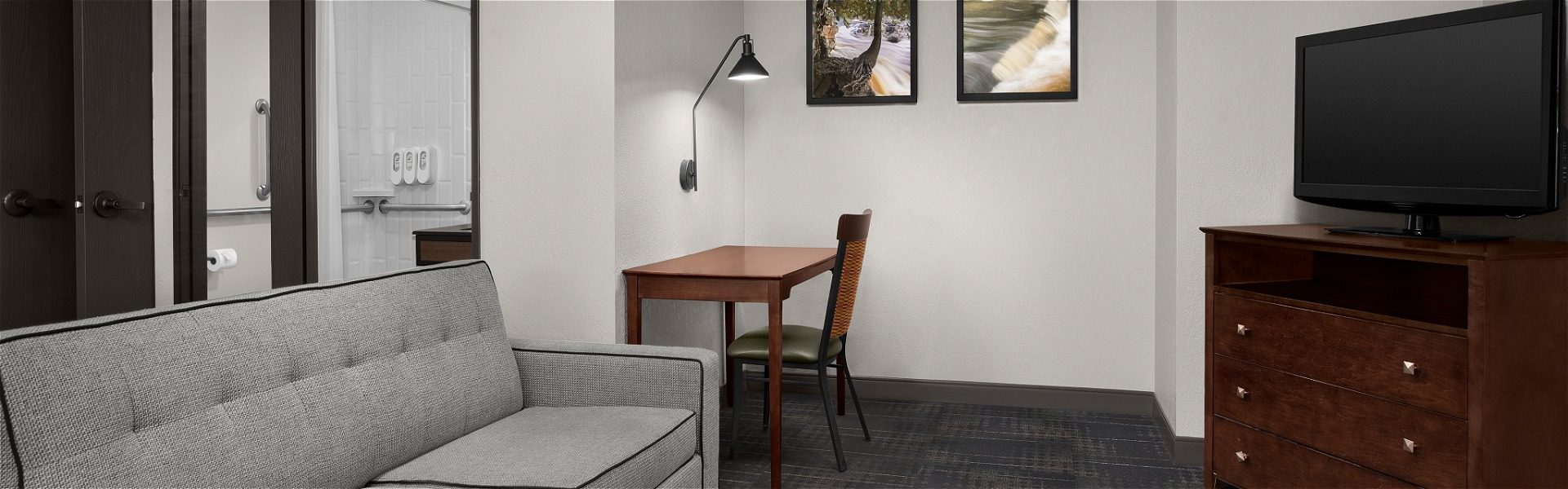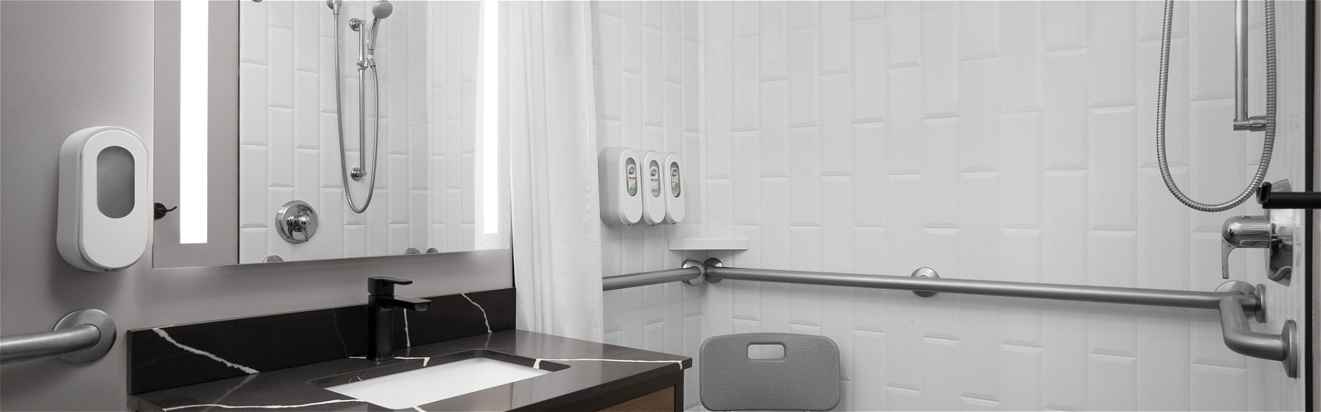 Accessible room features: 36" door clearance, braille door numbers, lower peep holes and chair lock on doors, fire alarm with strobe light, 24" bed height, close caption TV, roll-in shower with stool available, handheld shower head, grab bars in shower, 17" height on toilet and grab bars and 27"roll-up access to sink.